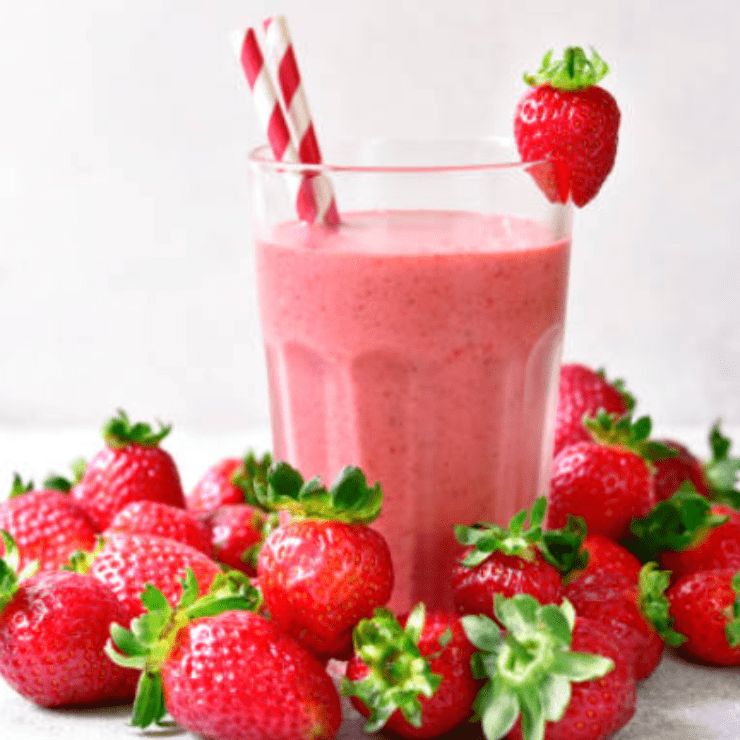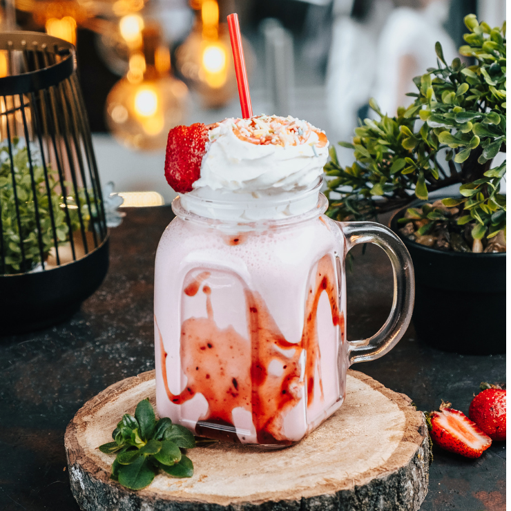 Our Strawberry Lassi, a delightful blend of ripe strawberries, creamy yogurt, and a hint of sweetness.