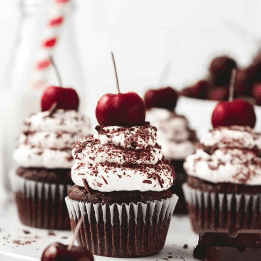 Our Black Forest cupcakes are a delightful combination of rich chocolate cake, tart cherries, and a smooth whipped cream topping, capturing the classic flavors of the beloved dessert in a perfect, portable treat.