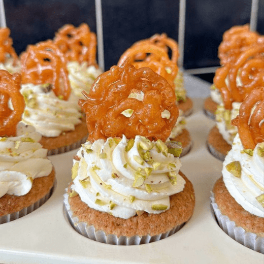 Our Jelabi cupcakes feature a soft, spongy cake infused with the sweet, floral flavors of traditional jelabi, topped with a sticky syrup glaze for a unique and delightful twist.