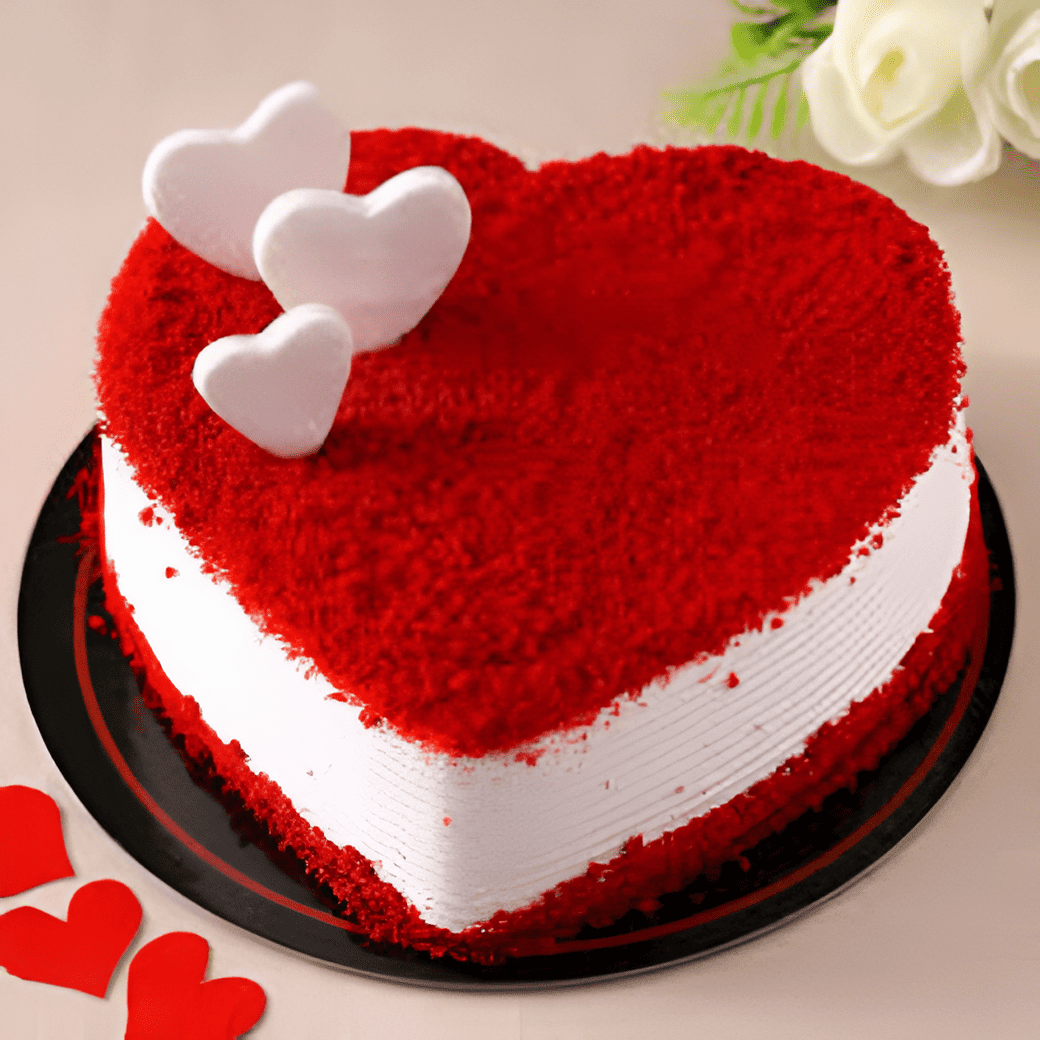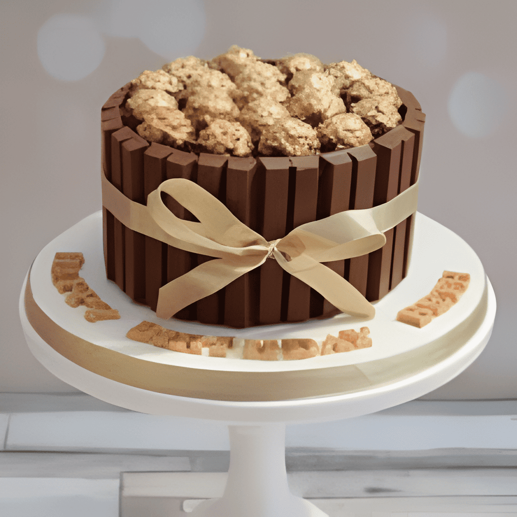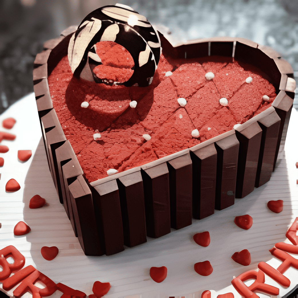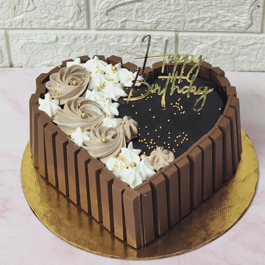 Our KitKat Heart Cake features a decadent chocolate cake layered with creamy frosting, decorated with crunchy KitKat bars arranged in a heart shape and topped with a sprinkle of colorful candy gems for a sweet and festive touch.