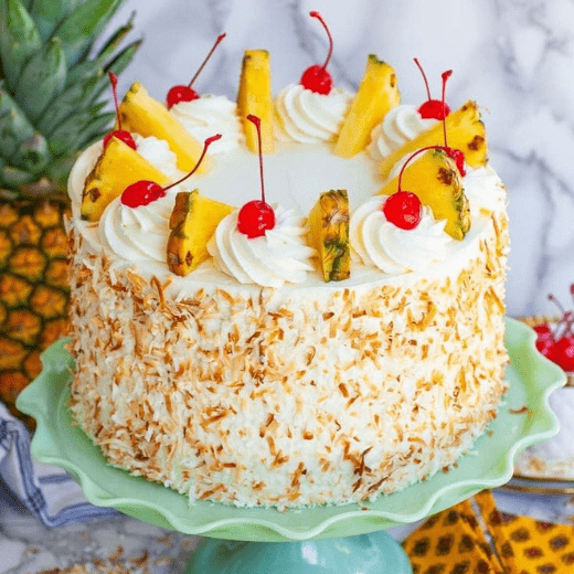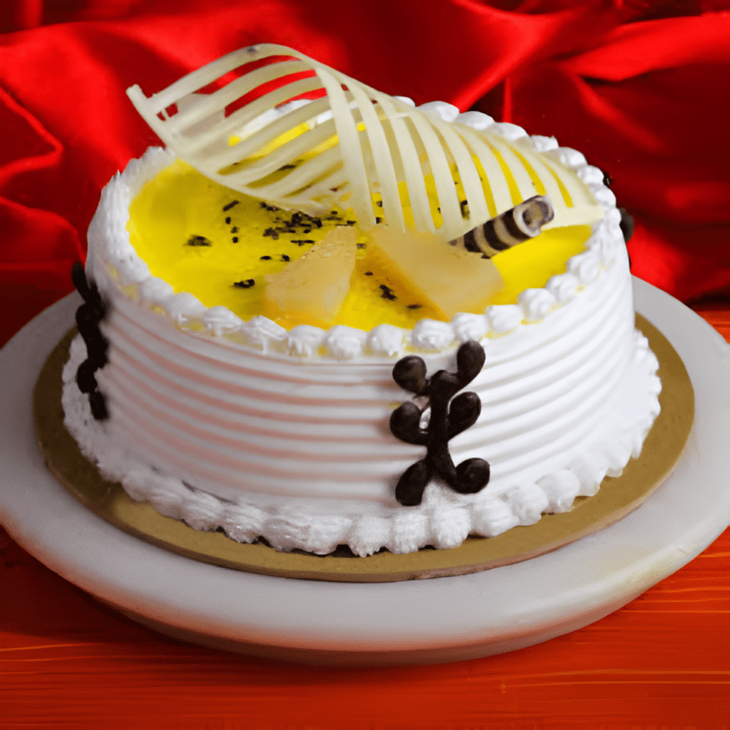 Our Pineapple Cake is a light and airy dessert with layers of moist cake infused with tropical pineapple flavor, topped with a smooth pineapple frosting and garnished with pineapple chunks for a refreshing, fruity treat.