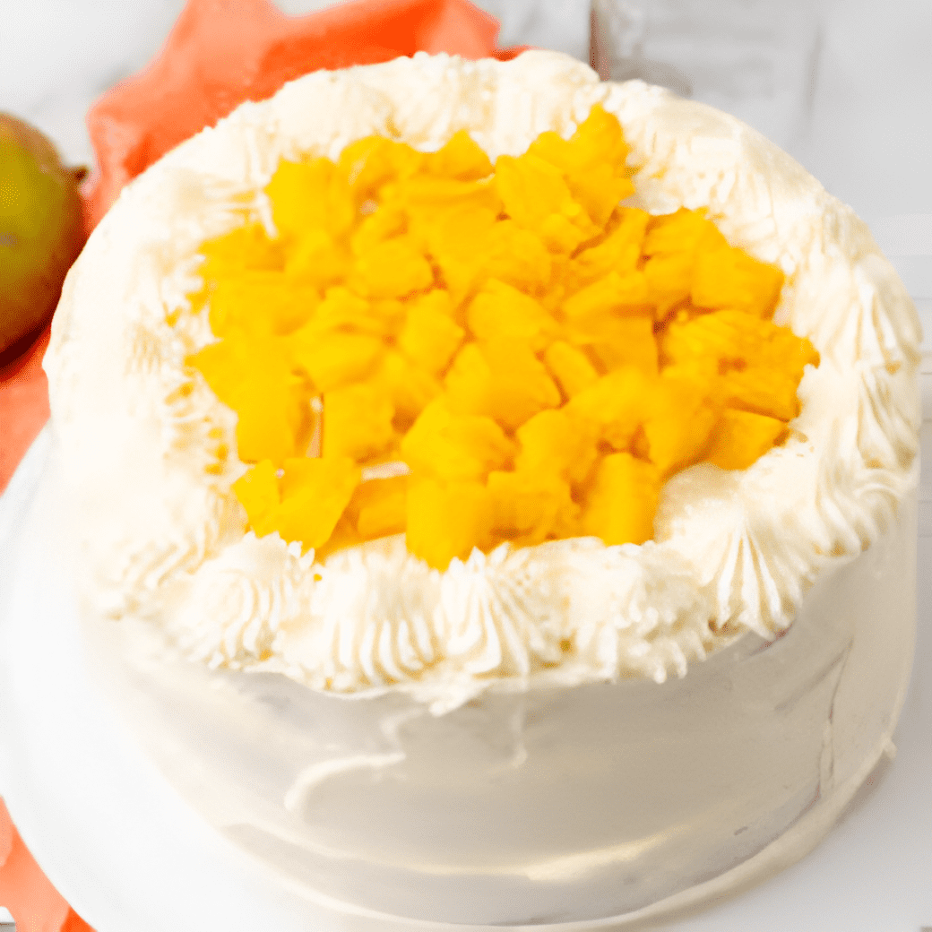Our Mango Cake is a light and refreshing dessert featuring moist cake layers infused with tropical mango flavor, topped with a smooth mango frosting and garnished with fresh mango slices for a sweet, fruity indulgence.