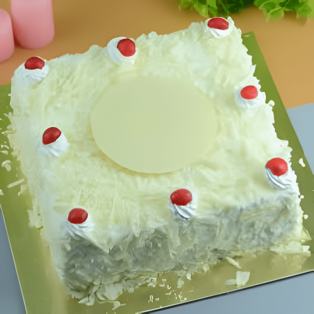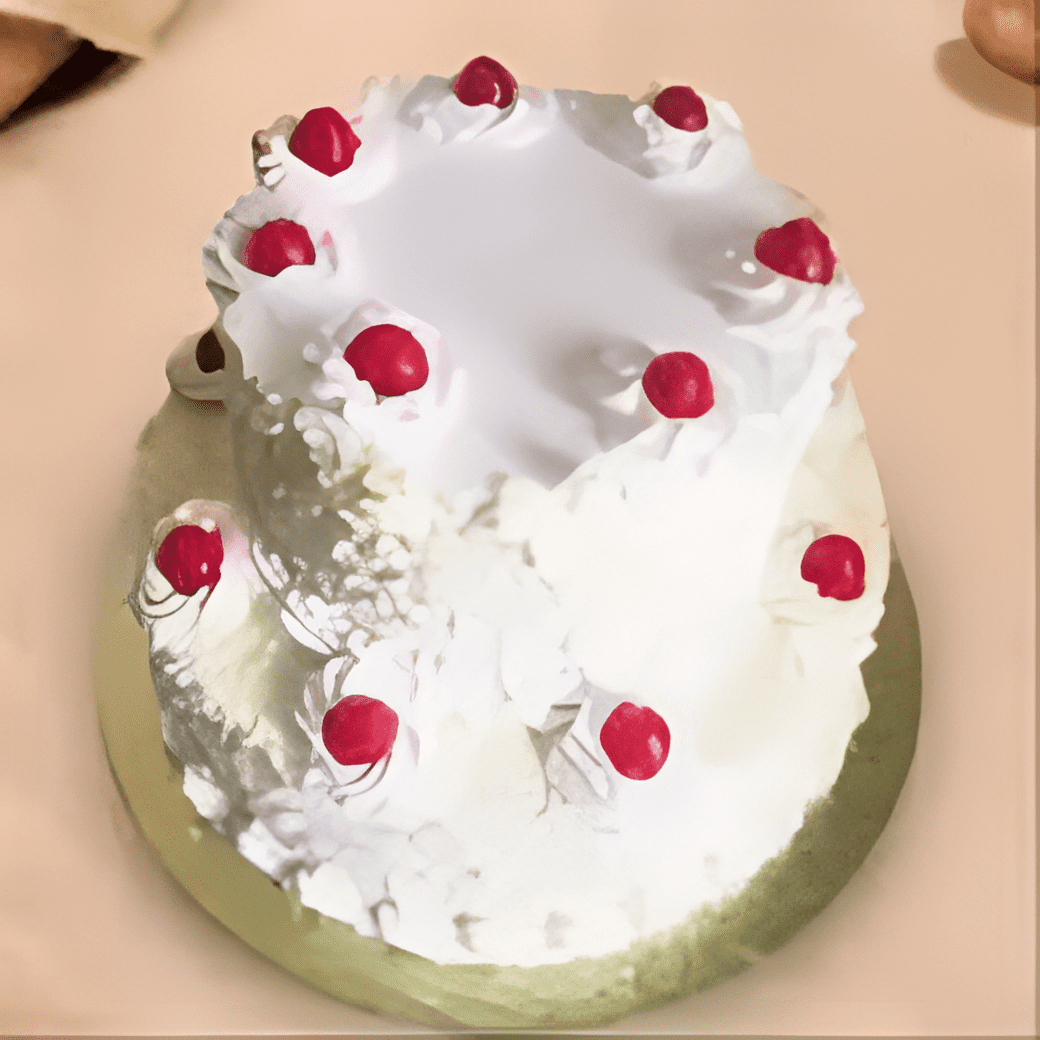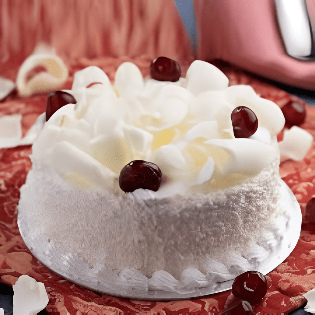 Our White Forest Cake features layers of light, vanilla-flavored cake interspersed with fresh cherries and creamy whipped frosting, topped with a generous sprinkle of white chocolate shavings for a delicate and elegant dessert.